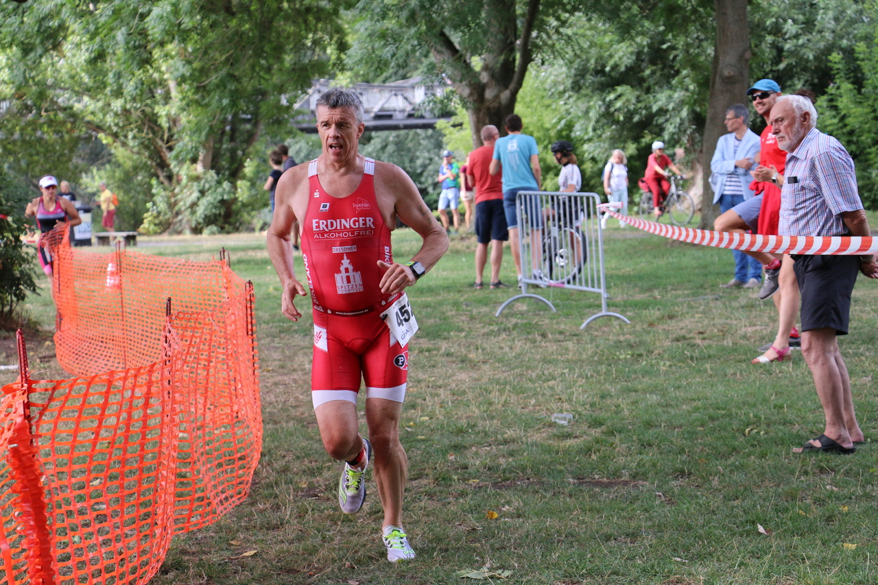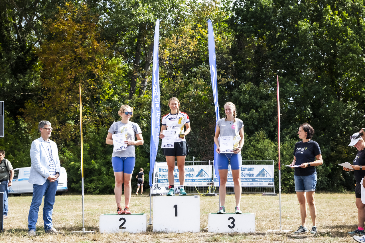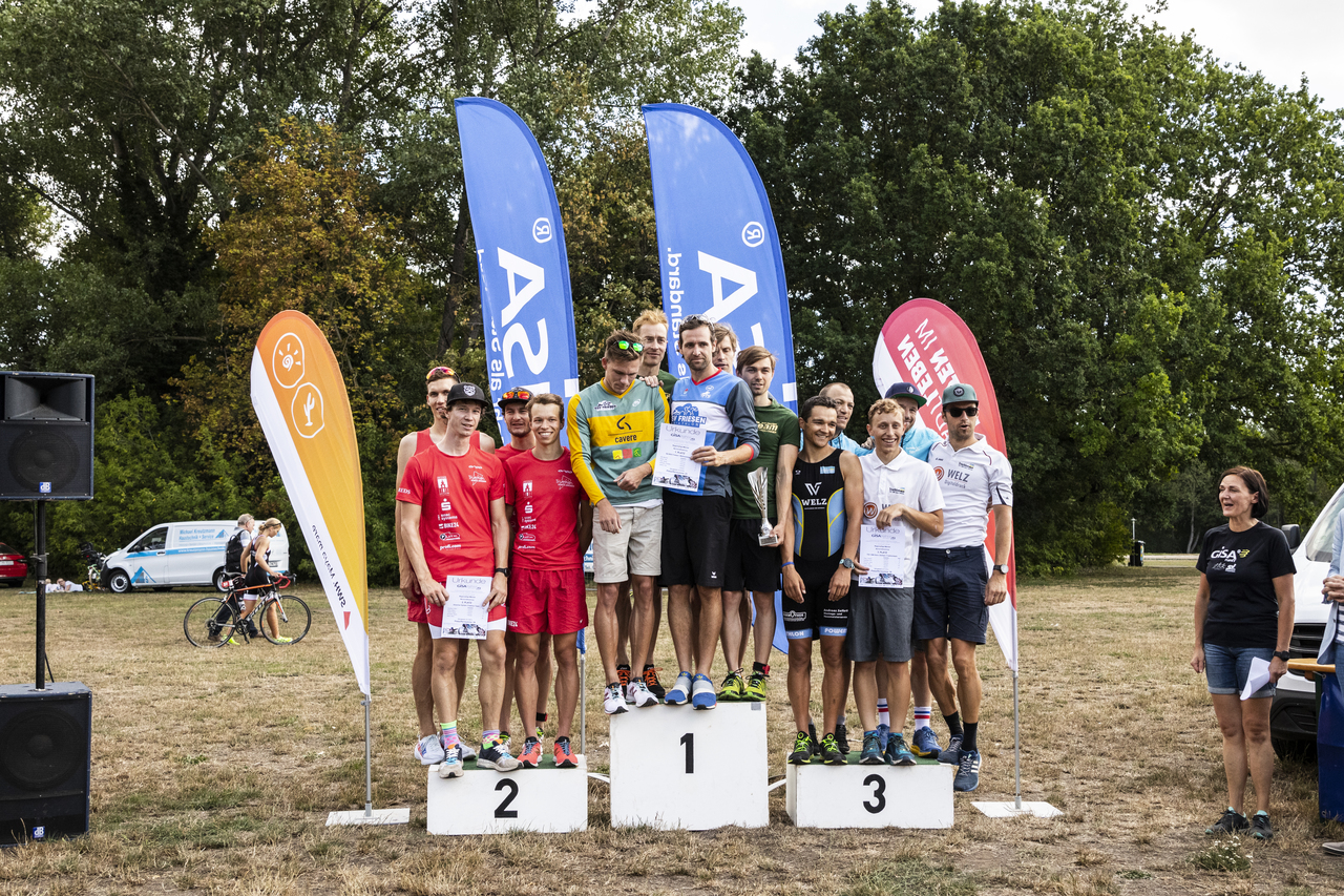 Nach dem Startschuss ging es für uns zunächst flussabwärts in der Saale bis zum Wendepunkt und anschließend wieder einige Meter stromaufwärts bis zum Schwimmausstieg. Endlich hatte ich mal ein richtig gutes Schwimmen. In der morgendlichen Sonne war das Schwimmen im Fluss ein toller Einstieg in den Wettkampf. Auf dem Rad angekommen ging es sofort ans Eingemachte. Die Radstrecke, eine 5km Runde, die es viermal zu fahren galt, war sehr kurvig und teils mit rauem Straßenbelag bestückt. Eine solche Strecke ist sicherlich nicht jedermanns Geschmack, ich kann nur sagen: es hat richtig gefetzt. Zugleich möchte ich eine derartige Strecke jedoch nicht unbedingt bei Regen fahren. Beim Radabstieg lag ich mittlerweile auf Platz 2, direkt hinter mir kam auch schon Marco angeflogen. Beim Laufen gibt es in so einer Situation eigentlich nur eine Devise: laufen was das Zeug hält. Sowas in der Art habe ich dann auch gemacht, leider konnte ich einen fliegenden Berliner nicht halten. Am Ende reichte es damit für den 3. Platz. Wieder auf dem Podium der Regio, jawoll! Im Ziel hieß es dann warten auf die nächsten roten Einteiler. Die kamen in Form von Marco und Robert auch innerhalb kurzer Zeit eingelaufen. Das Team der Friesen Weltraumjogger war an diesem Tag jedoch nicht zu schlagen und so landete das unser Männerteam 1 auf dem 2. Gesamtrang. Das zweite Männerteam kam im Mittelfeld auf Rang 6 an.