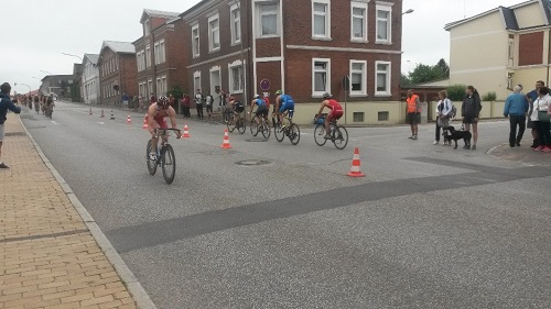 Der Schwimmstart verlief verhältnismäßig ruhig. Astrid schaffte es, sich weit vorn zu positionieren und damit auch den Sprung in die 1. Radgruppe. Louise beendete den Schwimmpart nur kurz nach ihr. Pauline und Jana kamen wenig später zusammen aus dem Wasser und mussten nun das Feld eher von hinten aufrollen.