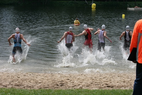 Mörg machte den Anfang und legte als Erster aus dem Wasser, fulminant wechselnd und als Startwellen-Zweiter gut vor. Für solch super kurze Schwimmen hatte er die neueste Entwicklung eines Neoprenherstellers eingepackt: Das Neopren reicht nur bis zu den Knien und soll somit einen hyperschnellen Wechsel ermöglichen. Das das Gerät wie ein 10Jahre alter Neopren mit halb abgeschnitten Beinen aussah, war wahrscheinlich nur Tarnung seitens des Herstellers. Als Nächster war ich an der Reihe, gelangte mit selten schweren Armen aus dem See und lief dem Ersten meiner Startwelle keuchend ins Ziel hinterher. Dann packte Martin seine imaginären Flossen aus und schwammlief durch den See und Matschrasen mit einer klasse Endzeit.