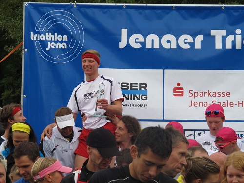 Die Akteure hatten sich deshalb trotz Sommerloch und Urlaub mindestens genauso akribisch auf das Finale vorbereitet wie auf die Rennen davor, ja womöglich morgens mal vor um 10 oder gar früher das Bett zum trainieren verlassen und gemessen an den Wettkampfstrecken astronomische Umfänge geschrubbt. Die waren ziemlich überschaubar, hatten es aber in sich: Die Vorgabe der Jenaer Regie war im 1. Akt ein Aquathlon über 0,25/2,5km in 5 Startwellen und nach der Sektpause ein Team-Bike&Run über 20/5km. Diese interessante Mischung wurde noch mit einem Bonuszeitensystem für den 1. Teil verkompliziert.