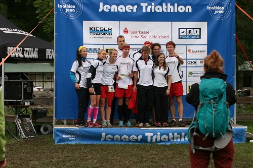 Die Damen verpassten das Podium nur knapp mit 6 Sekunden Rückstand auf die 3. Damenkonkurrenz, stieg bei der Gesamtsiegerehrung der Regionalliga aber verdient aufs Treppchen zum 2. Platz hinter den Leipziger Triathletinnen und vor den Damen aus Neukölln. Symptomatisch für das Pech des Tages fiel leider der Glaspokal vor der Ehrung zu Boden – aber Scherben bringen Glück, hoffentlich für die nächste Saison!