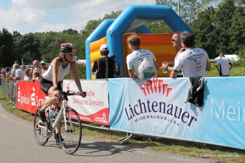 Der Wechsel war unkompliziert. Auf dem Rad sitzend, freute ich mich über die vielen Helfer, die klatschend Ablenkung und Motivation spendeten. Exzellentes Wetter wartete auf mich. Torsten Pawel winkte freudig von der gegenüberliegenden Seite. Das ist KNAPPENMAN. Nach der ersten Radrunde tönte der Lautsprecher...ich bin auf Platz 2. Das gibt es auch? So etwas hatte ich noch nicht erlebt.