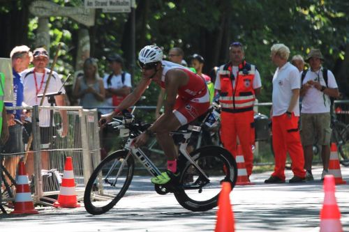 Halb taumelnd ging es von der Waagerechten in die Senkrechte beziehungsweise auf das Zweirad meines Vertrauens. Von Anfang an konnte ich ganz guten Druck aufs Pedalwerk bringen und einen nach dem anderen überholen. 40 Kilometer in 58 Minuten: läuft. Jan Frodeno scheint Recht zu haben – der freut sich nämlich immer über heiße Temperaturen und den damit verbundenen geringeren Windwiderständen. Ich freue mich wenn dann über Letzteres, denn der Dauerfön von vorn war extrem kräfteraubend und leider hat man dies erst zeitverzögert zu spüren bekommen.
