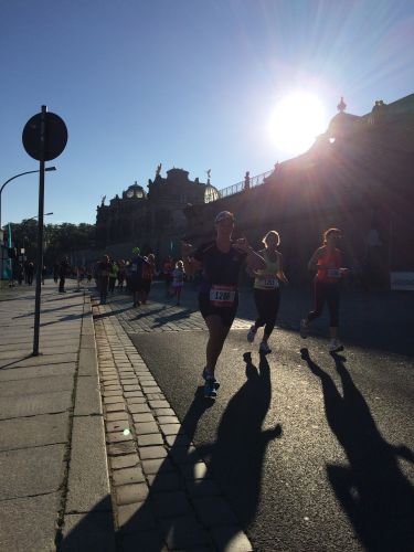 Pünktlich um 11:00 Uhr ging es dann los. Am Postplatz ging es nach links über ungeliebtes Kopfsteinpflaster über die Augustusbrücke und weiter zum Albertplatz. Dort über eine Schleife am Palaisplatz nochmal zum Albertplatz und anschließend durchs Kneipenviertel der äußeren Neustadt. Leider gab es hier kein Bier sondern nur einen Schnelldurchlauf. Hier würde ich dann von Tina angefeuert.