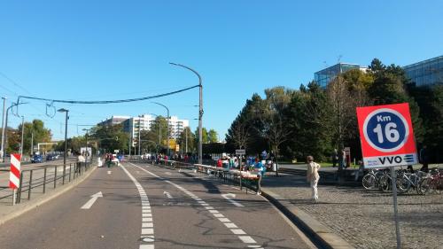 Mit sehr gutem Gefühl in den Beinen und einer Pace von knapp unter 4:00min/km ging es dann weiter Richtung Waldschlößchenbrücke. Nachdem das schützende Häusermeer der Neustadt hinter mir lag schlug die Hitze auf dem Weg zum großen Garten ordentlich zu, war aber noch einigermaßen erträglich. Hinter der bekannten Schleife durch den großen Garten folgte dann an der gläsernen Manufaktur der Verpflegungsstand des TV. Aufgrund der veränderten Streckenführung diesmal also etwas später als im Vorjahr. Natürlich könnte ich mir hier einer breiten Anfeuerung sicher sein.